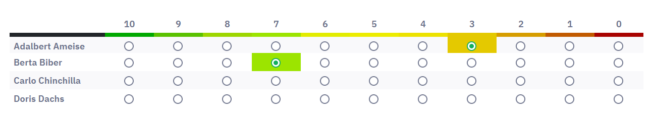 <style type="text/css"> .custom-array table.subquestion-list thead td, .custom-array table.subquestion-list thead th { border-bottom-width: 8px; border-bottom-style: solid; }.custom-array table.subquestion-list thead .column-1 { border-bottom-color: #00A800; } .custom-array table.subquestion-list thead .column-2 { border-bottom-color: #5AC100; } .custom-array table.subquestion-list thead .column-3 { border-bottom-color: #9DD600; } .custom-array table.subquestion-list thead .column-4 { border-bottom-color: #9CE400; } .custom-array table.subquestion-list thead .column-5 { border-bottom-color: #E2EC00; } .custom-array table.subquestion-list thead .column-6 { border-bottom-color: #ECEC00; } .custom-array table.subquestion-list thead .column-7 { border-bottom-color: #ECE200; } .custom-array table.subquestion-list thead .column-8 { border-bottom-color: #E4C900; } .custom-array table.subquestion-list thead .column-9 { border-bottom-color: #D69D00; } .custom-array table.subquestion-list thead .column-10 { border-bottom-color: #C15A00; } .custom-array table.subquestion-list thead .column-11 { border-bottom-color: #A80200; }.custom-array td.column-1:hover, .custom-array td.active-item.column-1 { background-color: #00A800; }.custom-array td.column-2:hover, .custom-array td.active-item.column-2 { background-color: #5AC100; }.custom-array td.column-3:hover, .custom-array td.active-item.column-3 { background-color: #9DD600; }.custom-array td.column-4:hover, .custom-array td.active-item.column-4 { background-color: #9CE400; }.custom-array td.column-5:hover, .custom-array td.active-item.column-5 { background-color: #E2EC00; }.custom-array td.column-6:hover, .custom-array td.active-item.column-6 { background-color: #ECEC00; }.custom-array td.column-7:hover, .custom-array td.active-item.column-7 { background-color: #ECE200; }.custom-array td.column-8:hover, .custom-array td.active-item.column-8 { background-color: #E4C900; }.custom-array td.column-9:hover, .custom-array td.active-item.column-9 { background-color: #D69D00; }.custom-array td.column-10:hover, .custom-array td.active-item.column-10 { background-color: #C15A00; }.custom-array td.column-11:hover, .custom-array td.active-item.column-11 { background-color: #A80200; } </style>