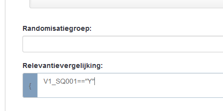 Ondertussen had ik ook nog wat verder gezocht en de code via ZetCondities (bij een gewone vraag) gekopieerd en geplakt bij de relevantievergelijking van een vraaggroep. Ik kreeg dan volgende code