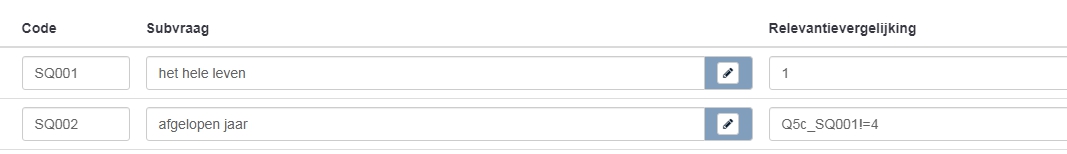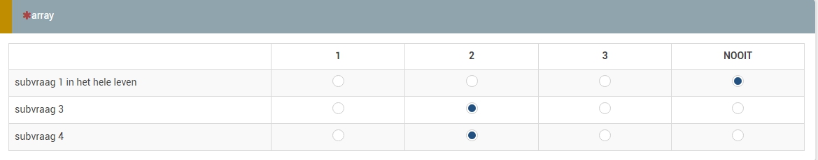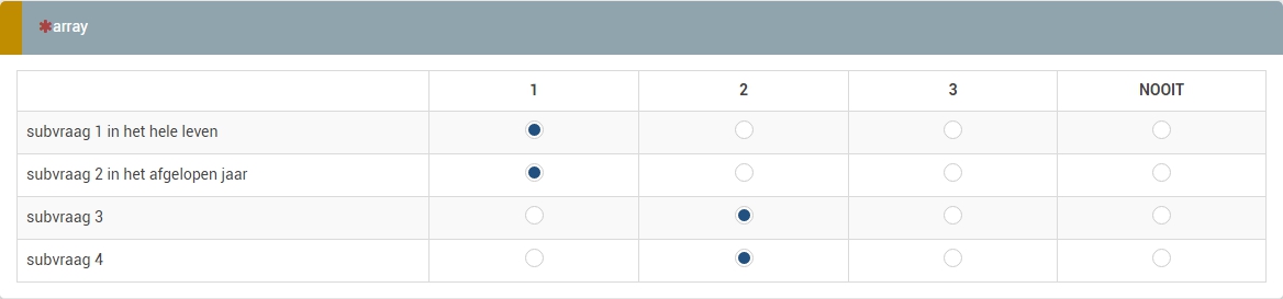 Bijv. als je in de eerste subvraag vraagt naar een situatie die men heeft ervaren in het hele leven en men vult in dat men die situatie NOOIT heeft ervaren dat je dan de volgende subvraag waarbij gevraagd wordt naar dezelfde situatie maar nu ervaren in het afgelopen jaar overslaat?
