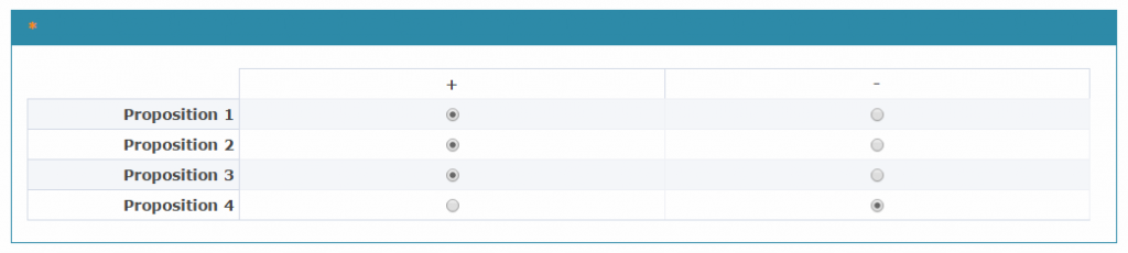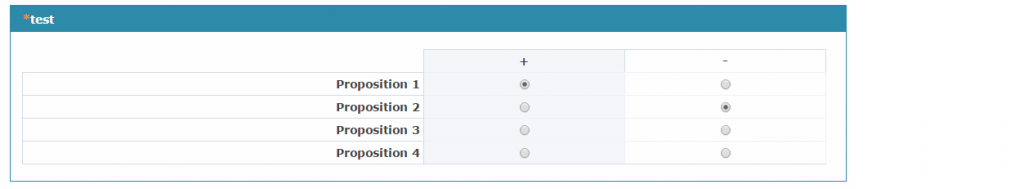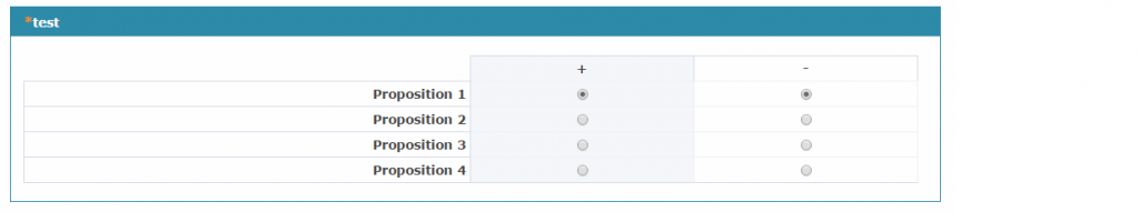 - La proposition sélectionné dans la colonne + doit être différente de la proposition sélectionné dans la colonne -
