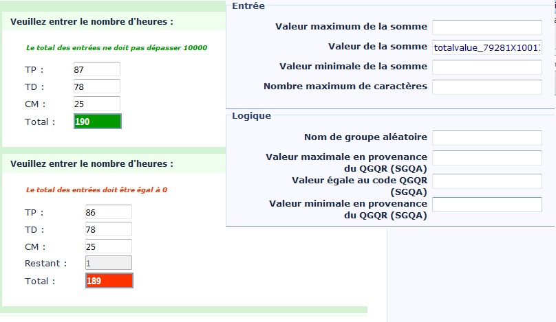 J'aimerais que les sommes de 2 questions "multiples numériques" soient identiques sinon un message d'erreur s'affiche.