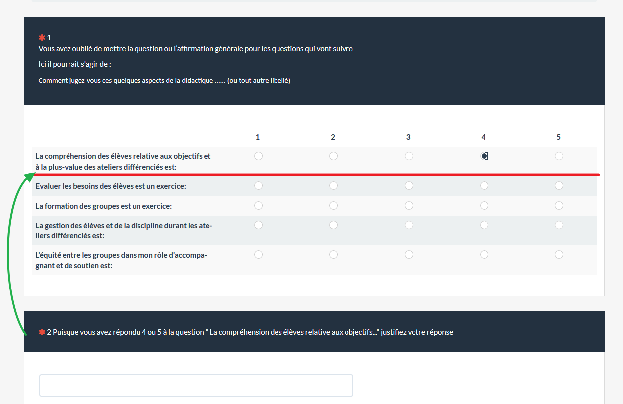 Dans un groupe de questions en format tableau, est-il possible de faire apparaitre une réponse texte court sous chaque question si on choisi les 2 valeurs à l’extrême de l'échelle P. EX. 4 ou 5