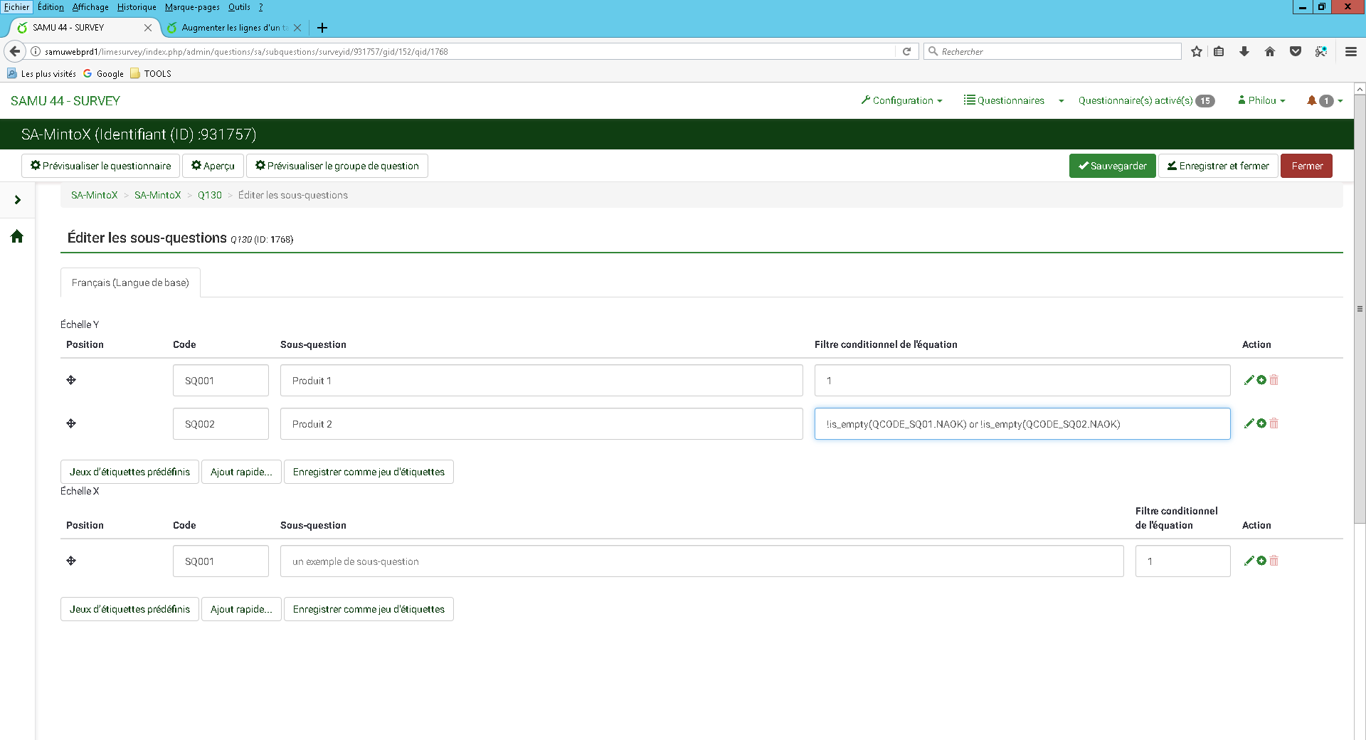 Je sais pas. Mais pour les lignes dynamique, depuis les conditions sous les sous-questions, j'ai ntendance à faire plutôt (sous questions de code SQ01 … question de code QCODE).