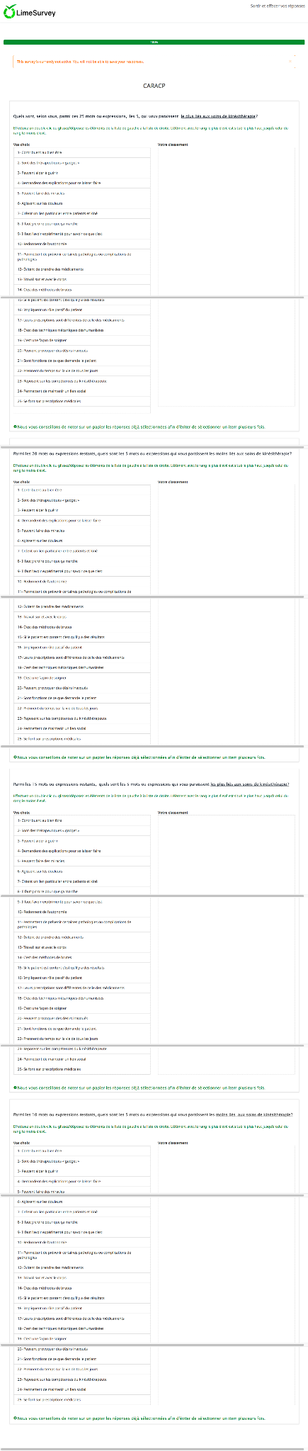 Dans mon exemple, Q9 propose de sélectionner 5 items parmi les 25 items à classer. Puis, Q10, devrait proposer les 20 items restant correspondant à ceux non sélectionnés dans Q9.