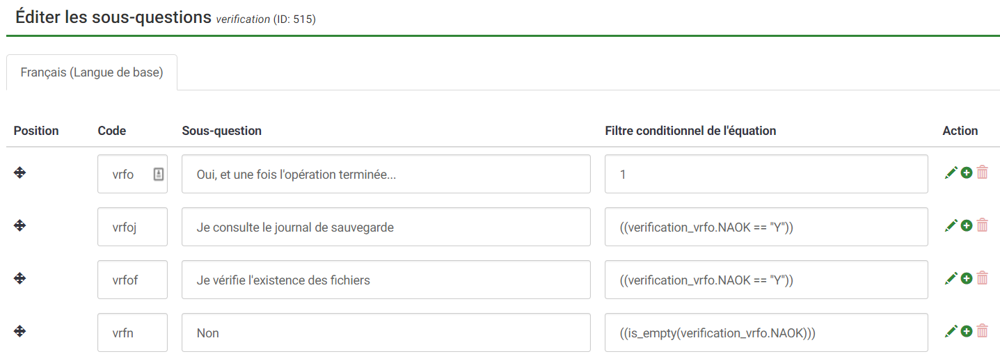 Dans une question à choix multiple "Vérifiez-vous la réussite du processus de sauvegarde", je souhaitais que l'on puisse répondre "'Oui" ou "Non", et si "Oui" était coché, cela fasse disparaître la ligne "Non" et à la place propose d'autres items pour détailler les opérations faites par la suite "