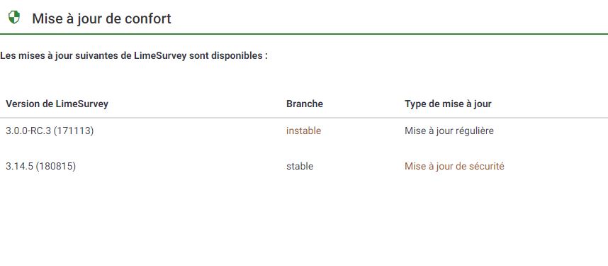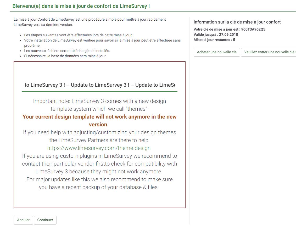maurad wrote: Bonjour, j'ai modifié les performances de mon serveur et modifié la version de php (5.3.36). Aucune amélioration quant à mon problème initial. La version imprimable qui est proposée aux répondants renvoie vers une page blanche avec mention "2017/2018" au lieu du récapitulatif du questionnaire précédemment remplis et de la mention "2018/2019".