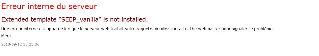 Merci du retour, je vais vérifier sur la dernière versionLarryF wrote: Autrement, mon collègue a supprimé le template "SEEP_vanilla" après l'avoir étendu, ce qui suggère un souci de cascade.