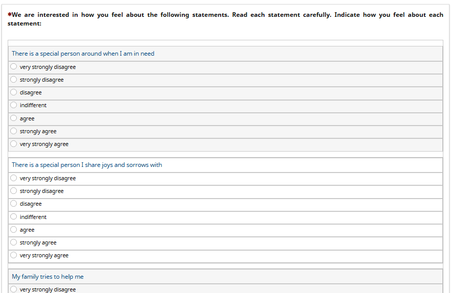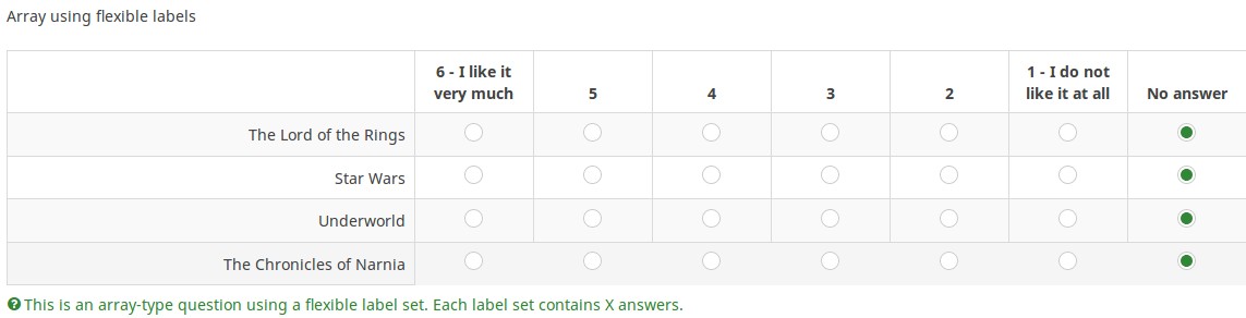 En gros, j'aimerais avoir un questionnaire avec une ligne d'options de réponses en haut unique, comme présenté dans cette image (qui est une image d'exemple de Limesurvey).