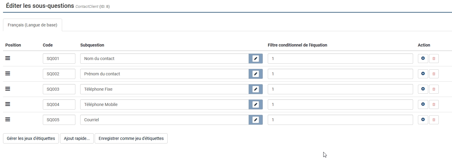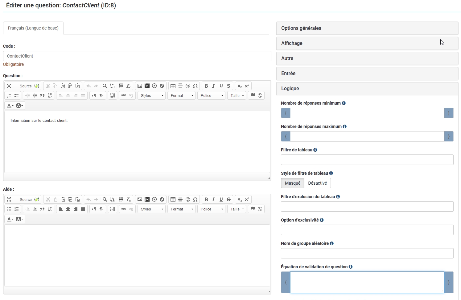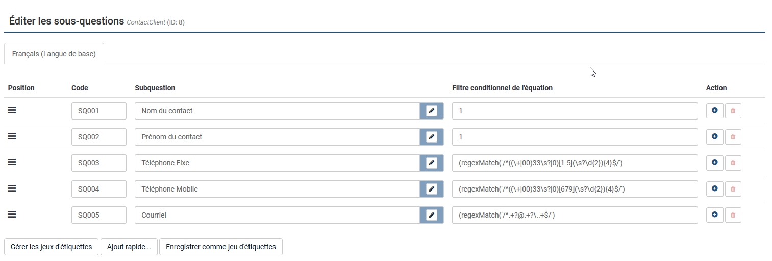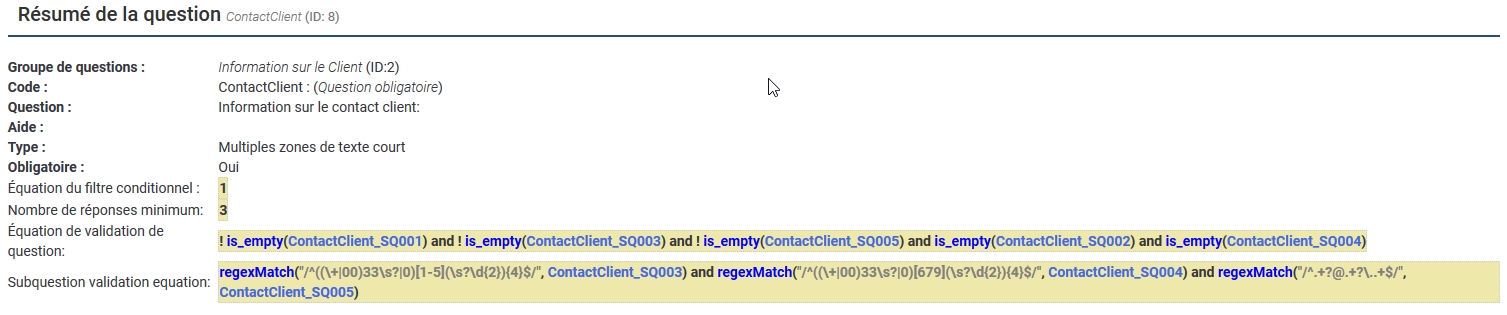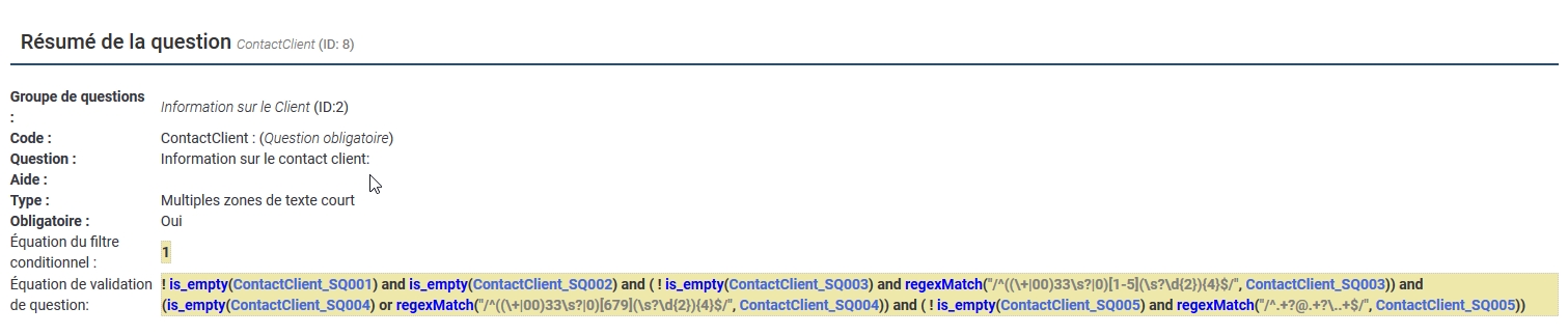 !is_empty(ContactClient_SQ001) /* Nom obligatoire */ and (!is_empty(ContactClient_SQ003) and regexMatch("/^((\+|00)33\s?|0)[1-5](\s?\d{2}){4}$/",ContactClient_SQ003) ) /* Téléphone obligatoire */ and (is_empty(ContactClient_SQ004) or regexMatch("/^((\+|00)33\s?|0)[679](\s?\d{2}){4}$/",ContactClient_SQ004) ) /* mobile non obligatoire */ and (!is_empty(ContactClient_SQ005) and regexMatch("/^.+?@.+?\..+$/",ContactClient_SQ005)) /* email obligatoire */