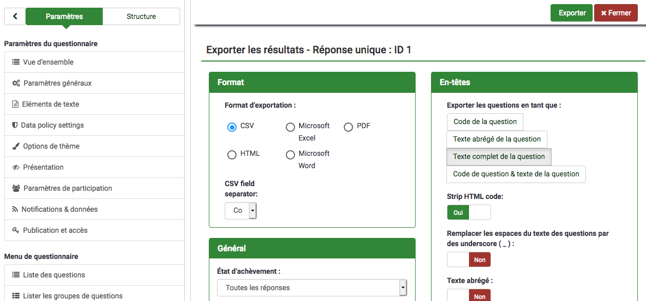 Pour info la fenêtre qui s'ouvre a comme titre : "Exporter les résultats - Réponse unique : ID 1" (cf capture d'écran jointe)