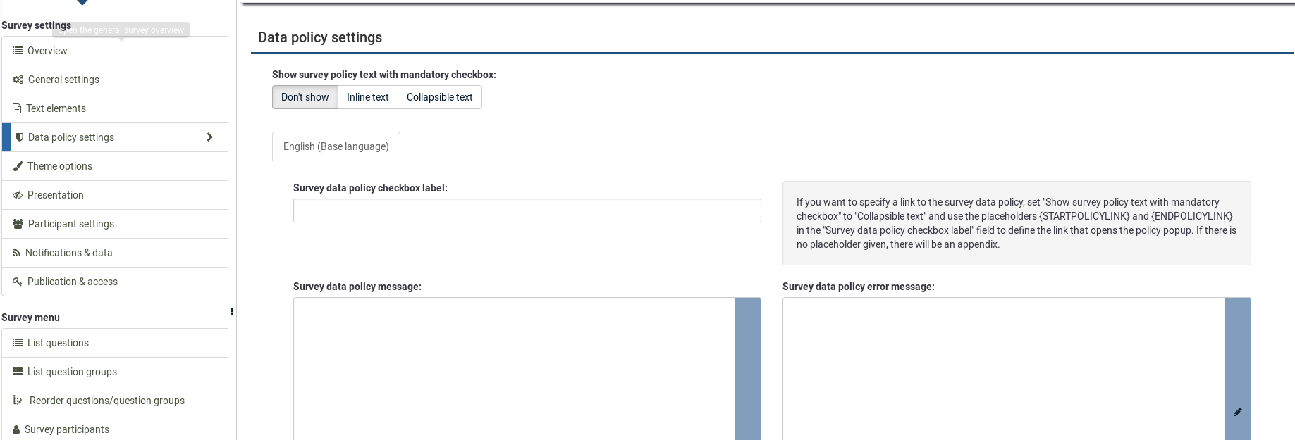 Tu peux supprimer les survey policy dans LimeSurvey 3, il me semble que ca passe.