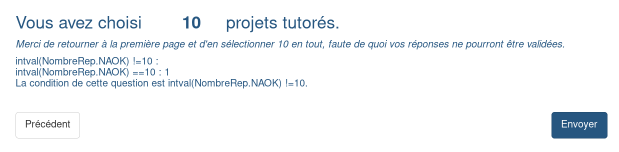 Mais je crois que je vais devoir tout recommencer : si j'ai bien compris, avec la structure actuelle, il n'y a pas moyen de bloquer l'envoi final du questionnaire s'ils n'ont pas sélectionnés leurs dix choix...