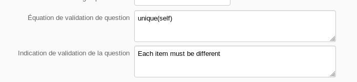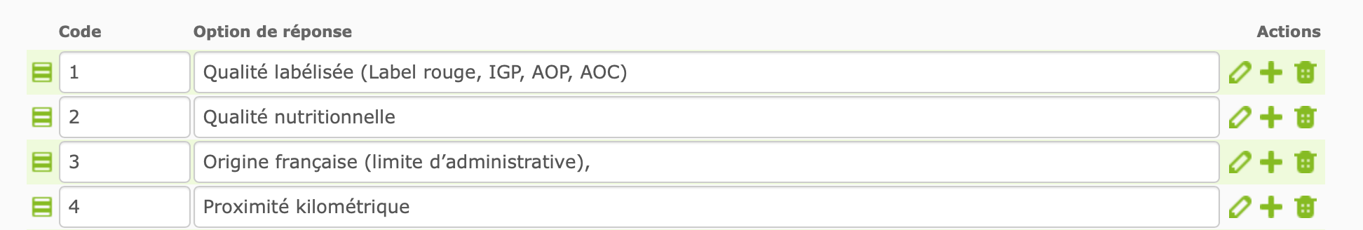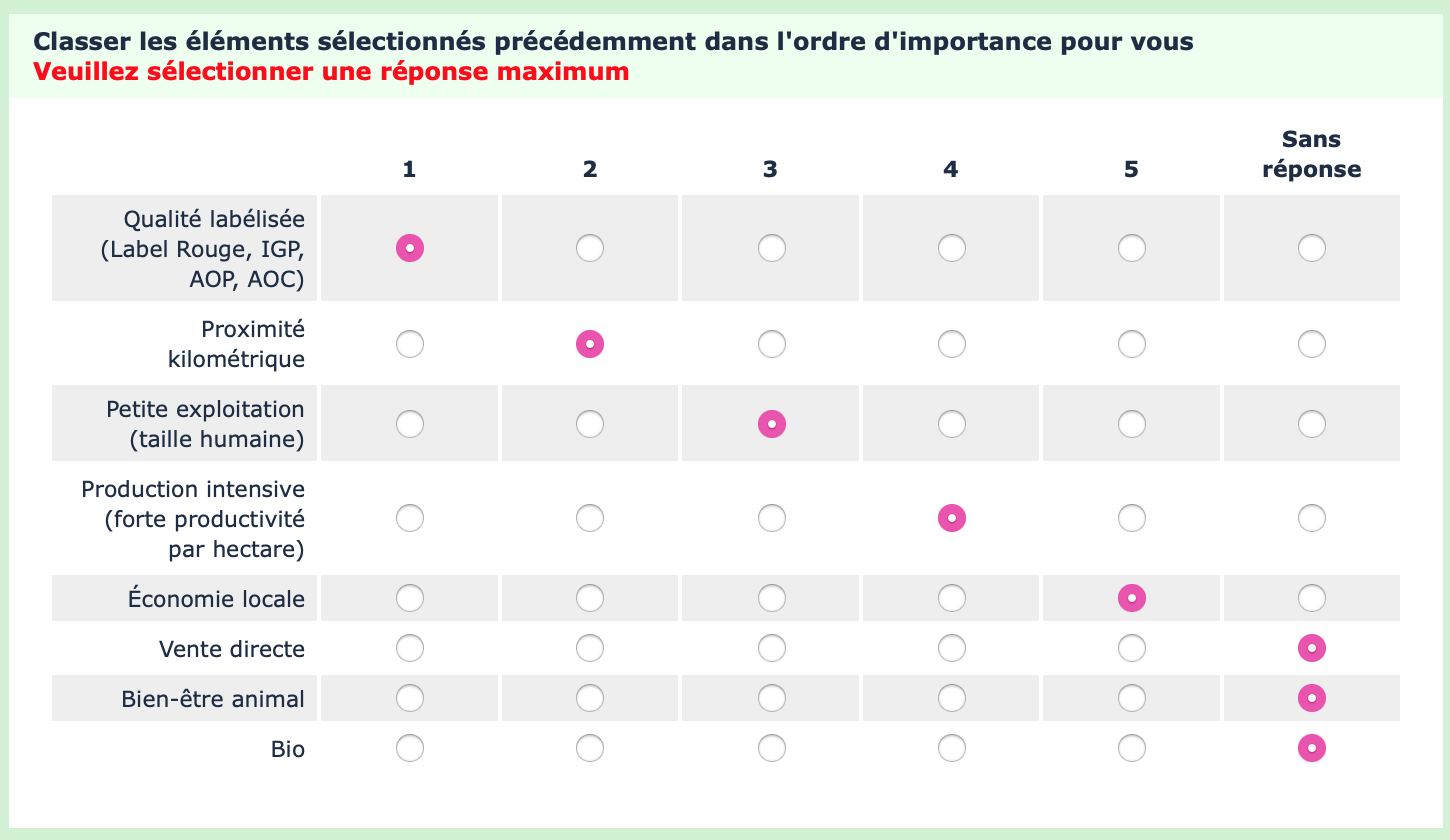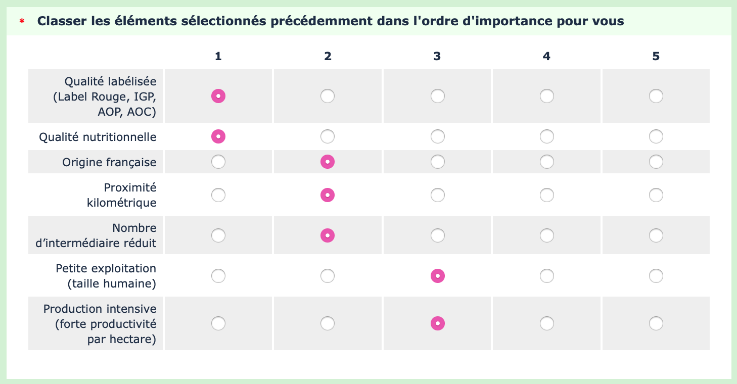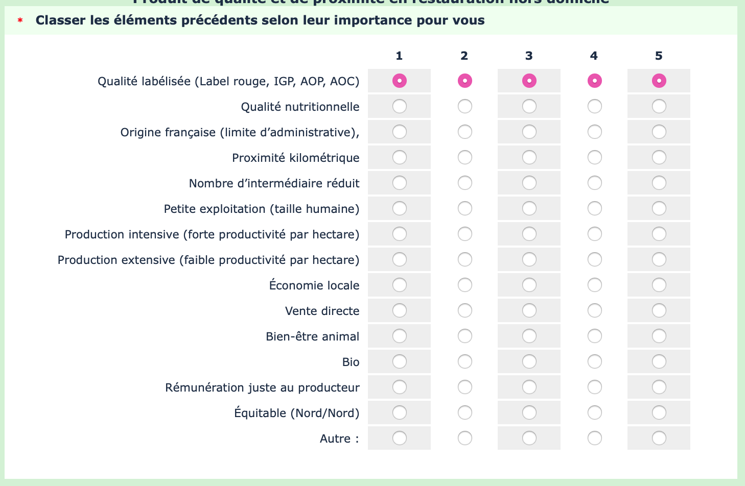 Dans la question suivante, je veux leur demander de classer 5 critères parmi ceux cochés précédemment. Pour ça, j'ai créé un tableau, avec des conditions sur les questions pour ne voir apparaitre que les réponses cochées dans la question précédente. J'aimerais qu'ils puissent classer uniquement les 5 plus importants pour eux et ce de façon unique, une question -> une réponse, j'aimerai que les réponses 1, 2, 3, 4 et 5 ne puissent être cochées que une seule fois pour avoir un classement correct. Or le format tableau ne me permet pas de faire ça. (seconde image)