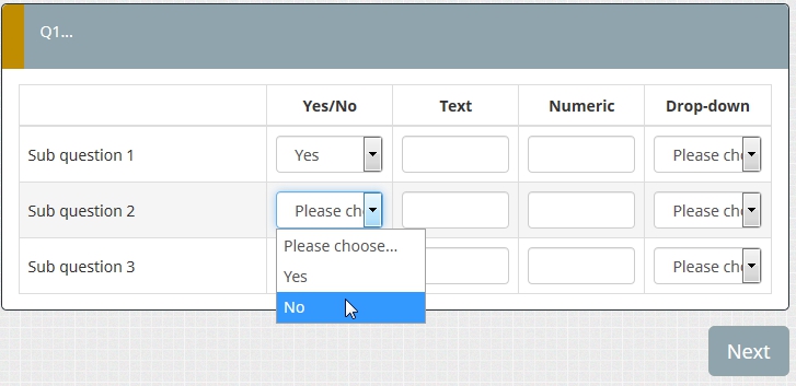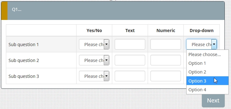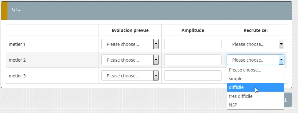 Avec le même objectif que @Monimeau, j'ai suivi les instructions pour la création du tableau. Je cherche à aligner 1) une question à choix multiple (une option de réponse par ligne), 2) une liste déroulante et 3) deux échelles likert. Toutefois, le processus est un vrai casse-tête étant donné mes connaissances en JS et CSS.