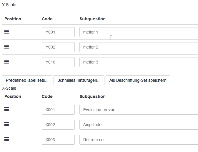 - Le workaround proposé par tpartner ( www.limesurvey.org/manual/Workarounds:_Q...stion_types_in_array ). J'ai téléchargé le modèle qu'il propose. Sauf qu'avec la version 3.22.5 (thème Fruity), il semblerait avoir un conflit. Je mets en pièce jointe un screenshot du résultat de son script avec ma version de LS. De plus, j'utilise des types de question différents à ceux qu'il utilise dans son exemple, ce qui m'amène à modifier le script. Je suis tout à fait partant pour le faire mais sans connaître les codes pour chaque question et les commandes à utiliser ça va vite faire n'importe quoi.