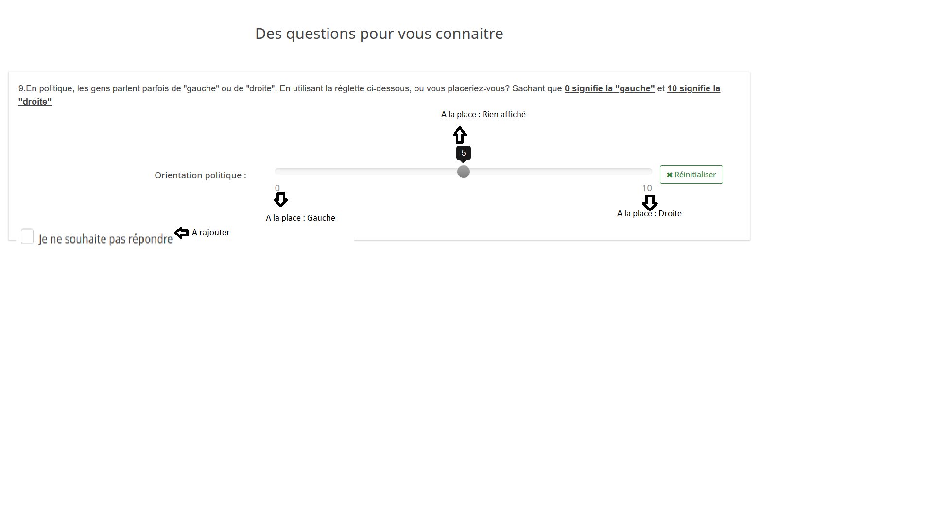 La situation initiale : Ma question initiale est déjà créer, elle porte sur l'orientation politique et elle de type "Multiple entré numérique". Je rajoute un curseur pouvant aller de 0 à 10 comme sur la photo précédente. Le code de la question est ORIP.