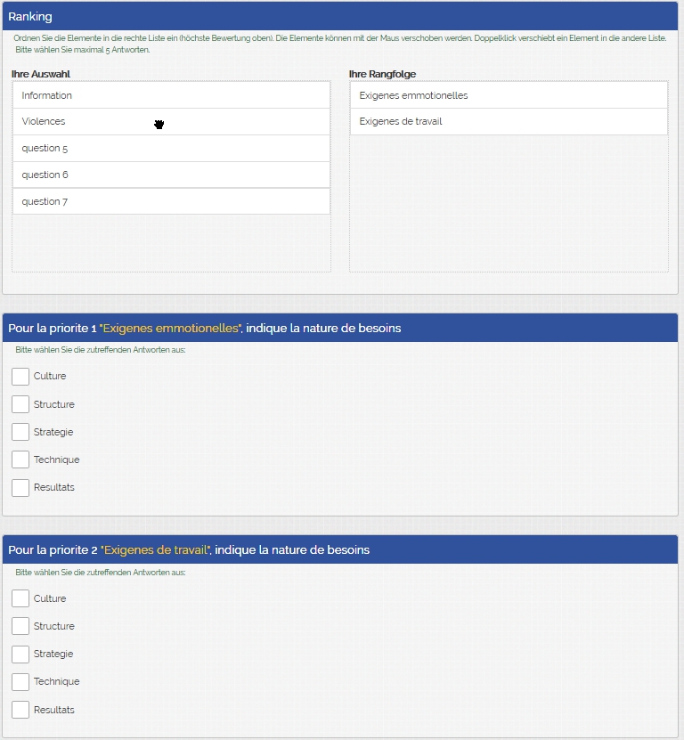 Voici notre souci: une première question (classement) afin que les participants classent les besoins par priorité. Ils peuvent en classer 5. Puis, pour les 5 priorités, il est demandé de définir la nature des besoins (soit 5 questions). Ce que nous aimerions, c'est que pour chaque participant, apparaisse dans la question sur la nature des besoins la priorité choisie à la question précédente.