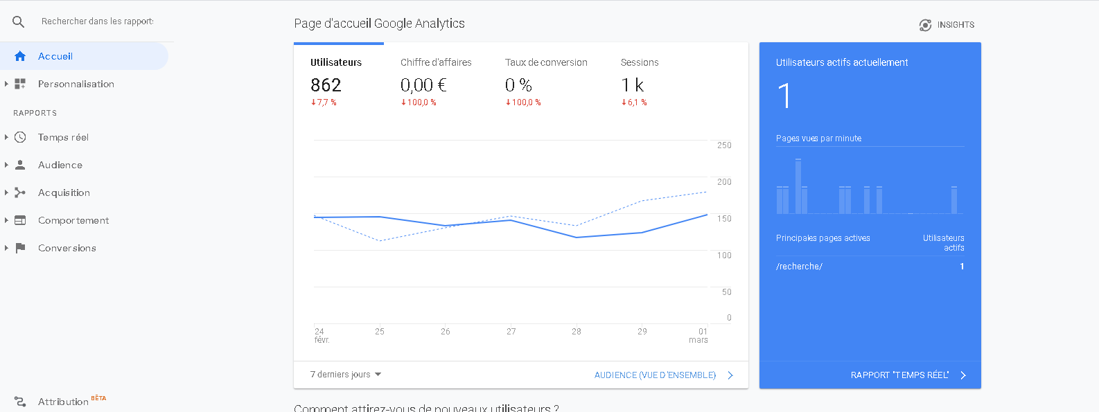 Est-ce quelqu'un peut m'aider à ce sujet ? Sur google analytics, dans la page d'accueil, le chiffre d'affaires est de 0,00 € et et le taux de conversion est de 0 % et ça depuis le 25/02/2020. Est-ce que quelqu'un a une idée pourquoi ? J'ai déjà fait quelques recherches et on m'a dit que ça peut être une mauvaise configuration des objectifs pourtant je les ai déjà reconfiguré et c'est toujours la même chose.