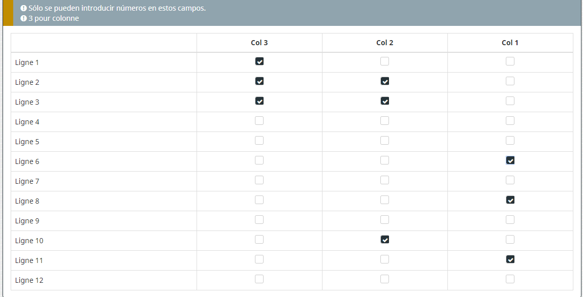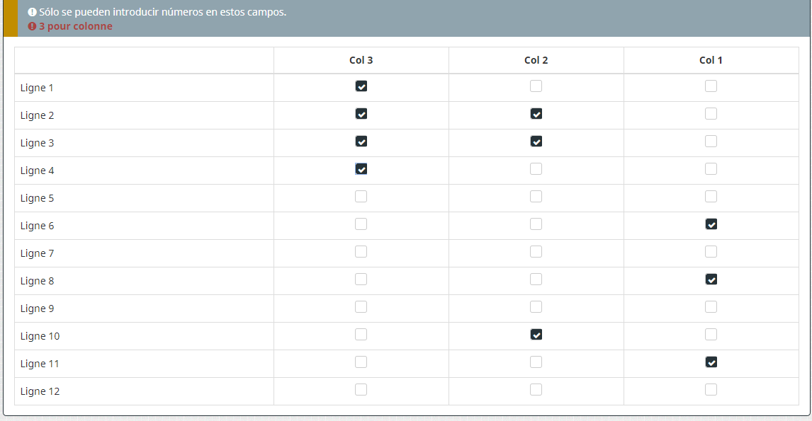 Dans mon tableau j'ai une dizaine de ligne et 3 colonnes. Je voudrais qu'ils cochent 3 cases, ni plus ni moins par colonnes. J'ai essayé via des filtres dans "Logique" mais je n'arrive pas au résultat souhaité.