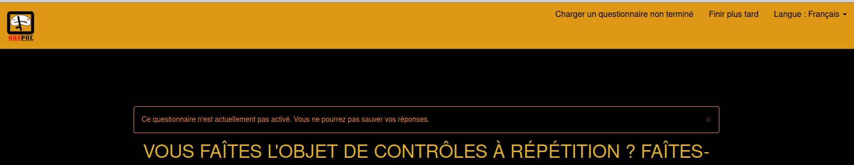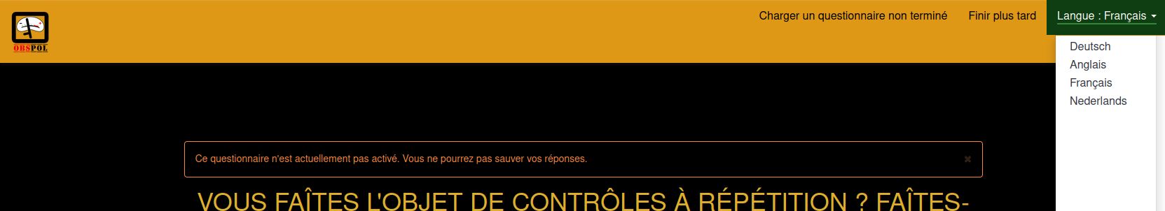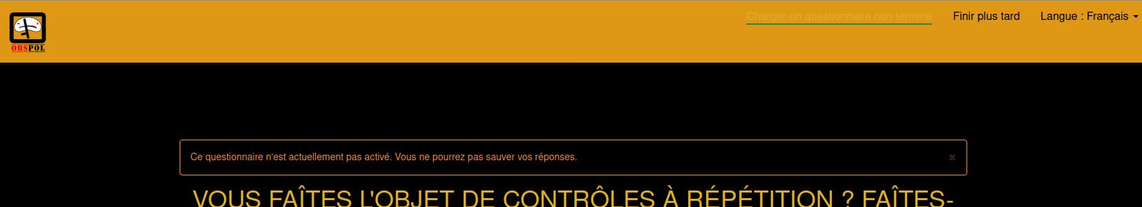 1/ la couleur de police des liens "Charger un questionnaire non terminé", "Finir plus tard" et "Langue", un gris moyen, était illisible sur mon fond orange. J'ai changé dans la custom CSS la couleur des liens (en noir maintenant, comme sur ce screenshot :