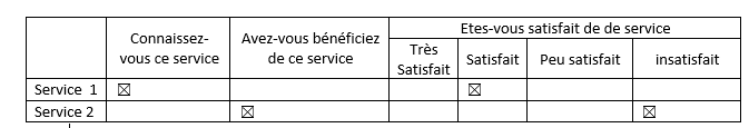 oui tout à fait , avec la précision qu'au niveau des 2 colonnes on peut cocher les deux à la fois ( l'enquêté peut savoir le service et en même temps il a déjà bénéficié càd répond par oui au niveau des 2 colonnes)