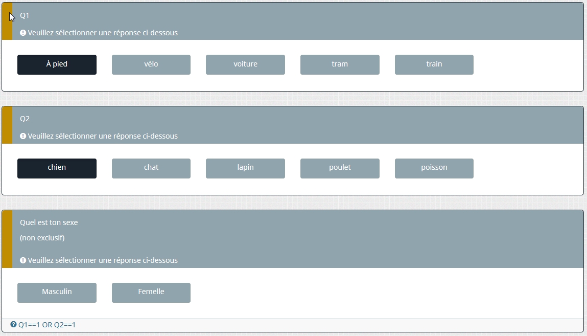 Je souhaite ajouter plusieurs conditions à une question, non cumulatives : il faudrait que la question Q03 soit montrée si Q02=1 ou si Q01=1.
