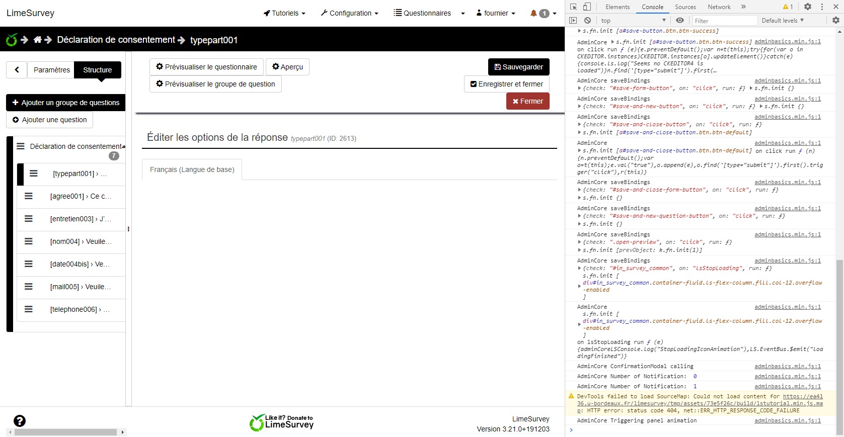 Après avoir importé plusieurs questionnaires sur mon compte LimeSurvey de l'université (j'ai les ai ré-importer à cause de l'endommagement d'un des serveurs), je viens de me rendre compte que je ne peux plus modifier les options de réponses de mes questions [type : liste (bouton radio)]... En effet, dès que je clique sur l'onglet "éditer les options de réponses", aucun encart ne s'affiche, pourtant tous le reste fonctionne correctement...