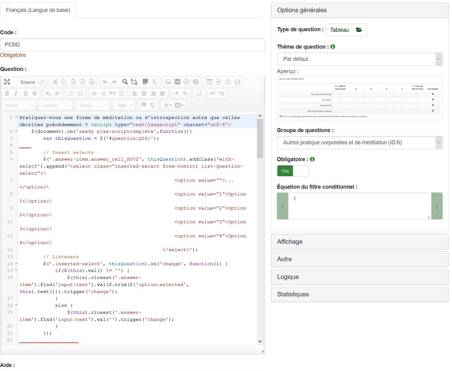 <script type="text/javascript" charset="utf-8"> $(document).on('ready pjax:scriptcomplete',function(){ var thisQuestion = $('#question{QID}'); // Insert selects $('.answer-item.answer_cell_X002', thisQuestion).addClass('with-select').append('<select class="inserted-select form-control list-question-select">\ <option value="">...</option>\ <option value="1">Option 1</option>\ <option value="2">Option 2</option>\ <option value="3">Option 3</option>\ <option value="4">Option 4</option>\ </select>'); // Listeners $('.inserted-select', thisQuestion).on('change', function(i) { if($(this).val() != '') { $(this).closest('.answer-item').find('input:text').val($.trim($('option:selected', this).text())).trigger('change'); } else { $(this).closest('.answer-item').find('input:text').val('').trigger('change'); } }); // Returning to page $('.with-select input:text', thisQuestion).each(function(i) { var thisCell = $(this).closest('.answer-item'); var inputText = $.trim($(this).val()); var selectval = $('select.inserted-select option', thisCell).filter(function () { return $(this).html() == inputText; }).val(); $('select.inserted-select', thisCell).val(selectval); }); // Clean-up styles $('select.inserted-select', thisQuestion).css({ 'max-width': '100%' }); $('.with-select input:text', thisQuestion).css({ 'position': 'absolute', 'left': '-9999em' }); }); </script> <script> $(document).ready(function() { // A function to add or remove rows of an Array (Multi Flexible)(Text) question function varLengthArray(qID) { if ($('#question'+qID+'').length > 0) { // The HTML content of the Add/Remove elements - modify as you wish var addContent = '[+] Ajouter'; var removeContent = '[-] Retirer'; // Create the Add and Remove elements & insert them var el1 = document.createElement('div'); el1.setAttribute('id','addButton'+qID); el1.setAttribute('class','btn btn-primary'); document.body.appendChild(el1); var el2 = document.createElement('div'); el2.setAttribute('id','removeButton'+qID); el2.setAttribute('class','btn btn-primary'); document.body.appendChild(el2); // Move them to after the array $( 'div#addButton'+qID ).appendTo($( '#question' + qID + ' table.ls-answers' ).parent()); $( 'div#removeButton'+qID ).appendTo($( '#question' + qID + ' table.ls-answers' ).parent()); // Insert their HTML $( 'div#addButton'+qID ).html( addContent ); $( 'div#removeButton'+qID ).html( removeContent ); // Style the elements - you can modify here if you wish $( 'div#addButton'+qID ).css({ 'margin':'10px 0 0 10px', 'padding':'1px', 'text-align':'center', 'width':'auto', 'cursor':'pointer', 'float':'left' }); $( 'div#removeButton'+qID ).css({ 'margin':'10px 0 0 10px', 'padding':'1px', 'text-align':'center', 'width':'auto', 'cursor':'pointer', 'float':'left' }); // Initially hide the Remove element $( 'div#removeButton'+qID ).hide(); // Call the functions below when clicked $( 'div#addButton'+qID ).click(function (event) { addRow(qID); }); $( 'div#removeButton'+qID ).click(function (event) { removeRow(qID); }); // Function to add a row, also shows the Remove element and hides the //Add element if all rows are shown function addRow(qID) { var arrayRow = '#question' + qID + ' table.ls-answers tr.subquestion-list'; var rowCount = $( arrayRow ).size() - 1; $( arrayRow + '[name="hidden"]:first' ).attr('name', 'visible').show(); $( 'div#removeButton'+qID ).show(); if ( $( arrayRow + ':eq(' + rowCount + ')' ).attr('name') == 'visible' ) { $( 'div#addButton'+qID ).hide(); } } // Function to remove a row, also clears the contents of the removed row, // shows the Add element if the last row is hidden and hides the Remove // element if only the first row is shown function removeRow(qID) { var arrayRow = '#question' + qID + ' table.ls-answers tr.subquestion-list'; var rowCount = $( arrayRow ).size() - 1; $( arrayRow + '[name="visible"]:last input[type="text"]' ).val(''); $( arrayRow + '[name="visible"]:last' ).attr('name', 'hidden').hide(); $( 'div#addButton'+qID ).show(); if ( $( arrayRow + ':eq(1)' ).attr('name') == 'hidden' ) { $( 'div#removeButton'+qID ).hide(); } } // Just some initialization stuff var arrayRow = '#question' + qID + ' table.ls-answers tr.subquestion-list'; var rowCount = ''; // Initially hide all except first row or any rows with populated inputs $( arrayRow ).each(function(i) { if ( i > 0 ) { // We also need to give the hidden rows a name cause IE doesn't // recognize jQuery :visible selector consistently $( this ).attr('name', 'hidden').hide(); $('input[type=text]', this).each(function(i) { if ($(this).attr('value') != '') { $(this).parents('tbody:eq(0)').attr('name', 'visible').show(); $( 'div#removeButton'+qID ).show(); } }); rowCount = i; } }); } } // Call the function with a question ID varLengthArray({QID}); }); </script>