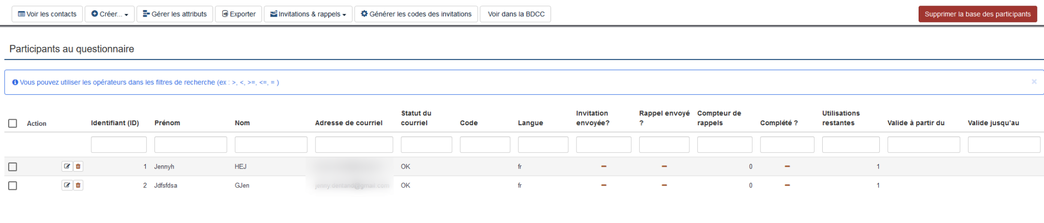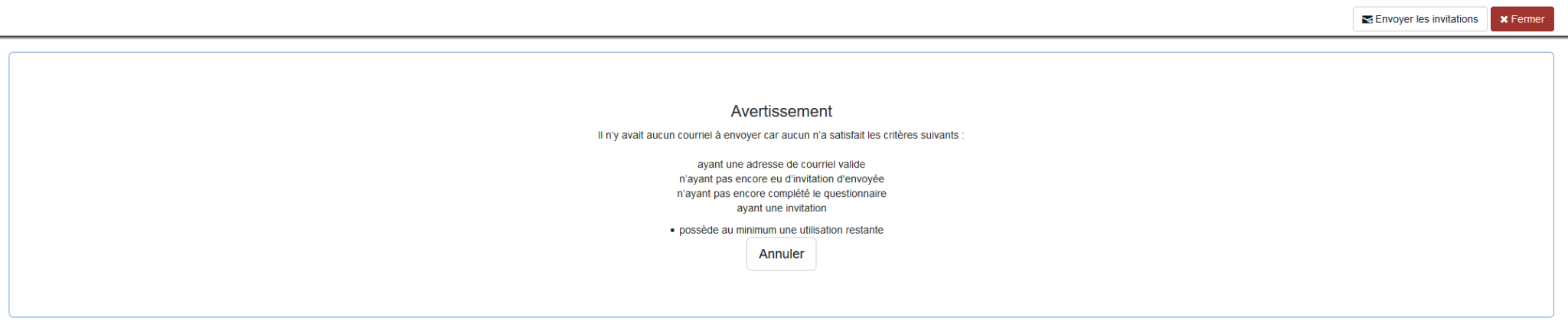 Je souhaite tester mon questionnaire en l'envoyant à 2 participants tests (voir pièce jointe 2021-02-08_11h46_29.png). Lors de l'envoi de l'invitation, LimeSurvey m'envoie l'erreur suivante (voir pièce jointe 2021-02-08_11h44_08.png). Pourriez-vous me dire quelle est l'action que j'ai mal faite?
