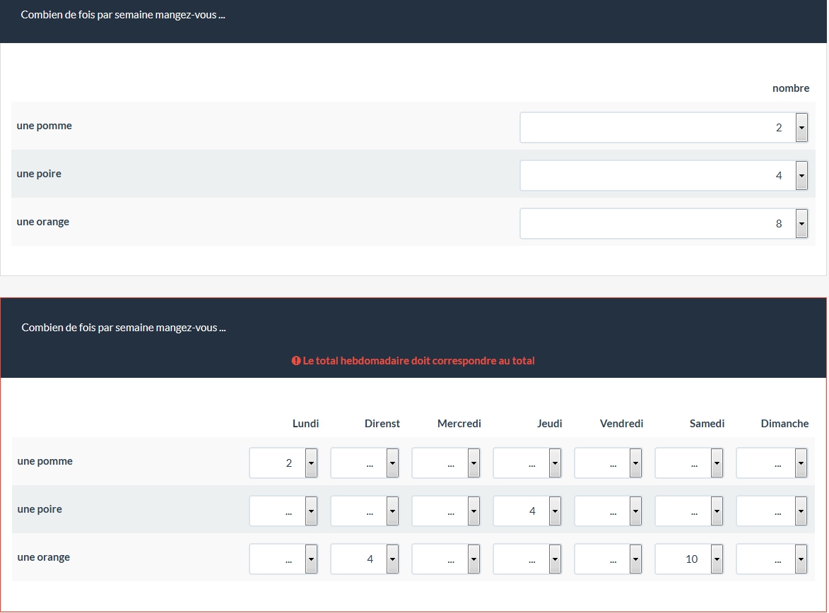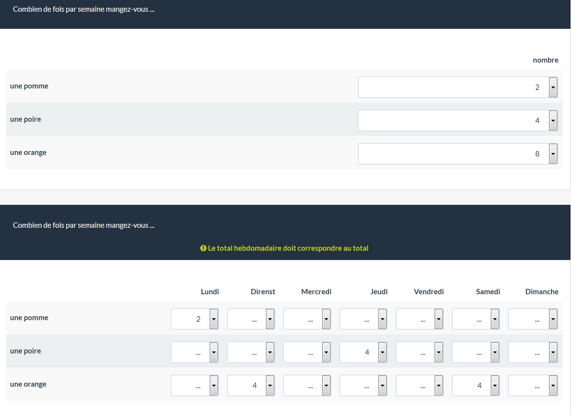 La question suivante demande que les réponses aux questions précédentes soient réparties en fonction des jours de la semaine (sous forma de tableau à double entrée):