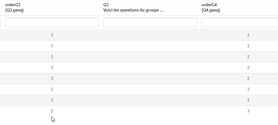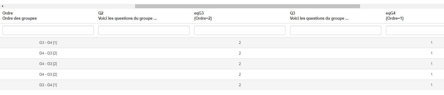 Je viens de prendre en main Lime Survey, et bien que je sois parvenue à mettre en aléatoire l'ordre de passation de deux groupes de questions, je ne vois pas apparaitre cet ordre dans l'extraction des résultats. Ainsi, sur l'extraction Excel je vois apparaitre mes items sur le groupe 1 (Agp1) puis sur le groupe 2 (Agp2) or mes participants test ont répondu à ces deux groupes de questions dans un ordre aléatoire (Agp1/Agp2 pour certains et Agp2/Agp1 pour d'autres) et je souhaiterais voir apparaitre la condition de passation dans laquelle ils se trouvaient.