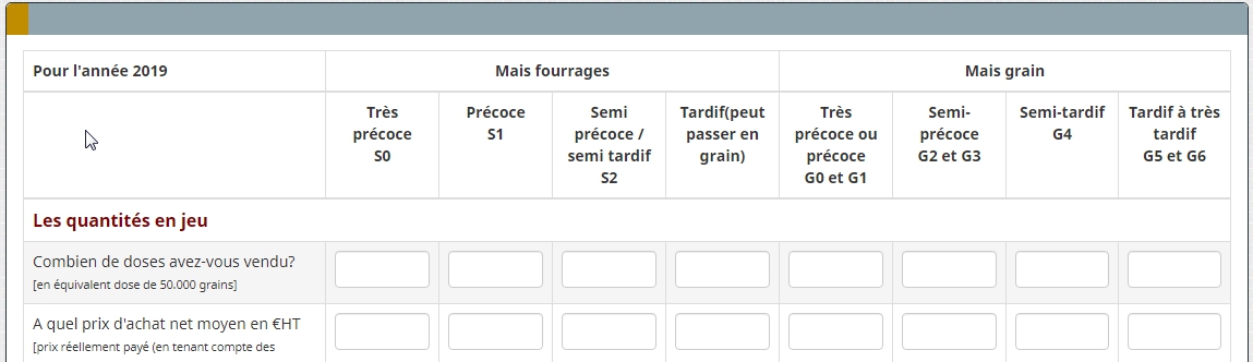 $('table.subquestion-list thead', thisQuestion).prepend('<tr class="new-header">\ <th style="text-align:left;"><strong>Pour l\'année 2019</strong></th>\ <th colspan="4" style="text-align:center;"><strong>Mais fourrages</strong></th>\ <th colspan="4" style="text-align:center;"><strong>Mais grain</strong></th>\ </tr>');