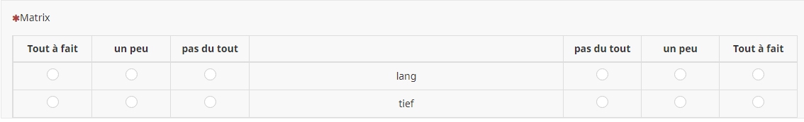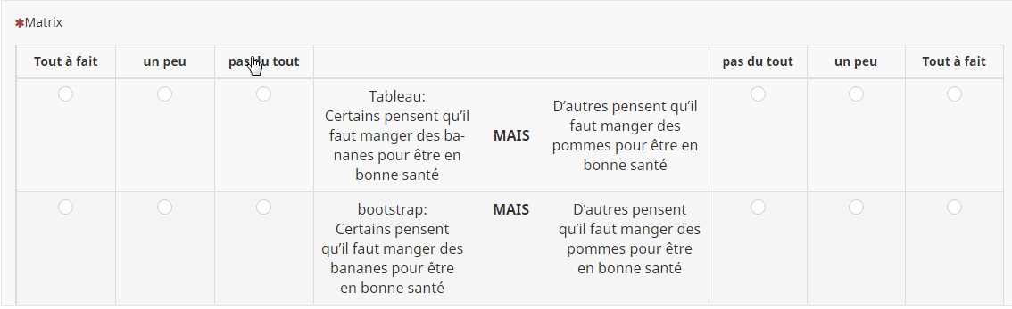 <style type="text/css">.custom-array table.subquestion-list col { width: auto !important; } /* Réglez la largeur comme vous le souhaitez! */ .custom-array table.subquestion-list thead .column-0 { width: 0%; } .custom-array table.subquestion-list thead .column-1 { width: 10%; } .custom-array table.subquestion-list thead .column-2 { width: 10%; } .custom-array table.subquestion-list thead .column-3 { width: 10%; } .custom-array table.subquestion-list thead .column-4 { width: 40%; } .custom-array table.subquestion-list thead .column-5 { width: 10%; } .custom-array table.subquestion-list thead .column-6 { width: 10%; } .custom-array table.subquestion-list thead .column-7 { width: 10%; } .ls-answers .answertextright { text-align: center; } </style>