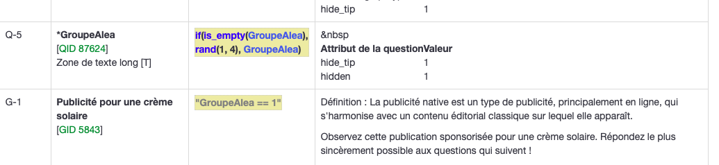 Bonjour, Dans le cadre de mon mémoire de recherche, je dois soumettre à quatre groupes de participants un questionnaire différent. Le questionnaire est composé d'une partie introduction qui doit être visible par tous les groupes de participants mais aussi la conclusion avec les données socio-démographique.Entre ces deux groupes, il y a 4 groupes de question qui doit être réparti aléatoirement après l'introduction. Je ne sais pas si je m'y prends mal, mais la fonction aléatoire ne fonctionne pas...La procédure que j'ai suivi : - Créer une question dans le groupe introduction avec l'équation : if(is_empty(GroupeAlea), rand(1, 4), GroupeAlea.NAOK). La question est caché aux participants. - Pour chaque groupe de question, j'ai mis en filtre conditionnel "GroupeAlea == 1" pour le groupe de question 1, "GroupeAlea == 2" pour le groupe de question 2 etc... Je ne sais pas si j'ai manqué quelque chose, mais je ne vois pas comment m’y prendre autrement...