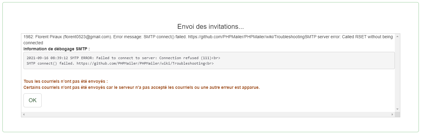 Lorsque que j'envoie des invitations avec mon serveur SMTP, j'ai le message d'erreur suivant : SMTP ERROR: Failed to connect to server: Connection refused (111)<br>