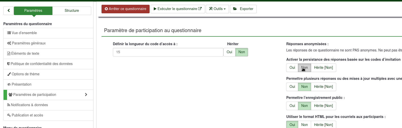 J'ai crée un questionnaire en ligne limesurvey. J'ai autorisé l'option "finir plus tard" car c'est un questionnaire se fait à 2 temps. C'est une seule et même personne qui saisi l'ensemble des questionnaires de notre étude.