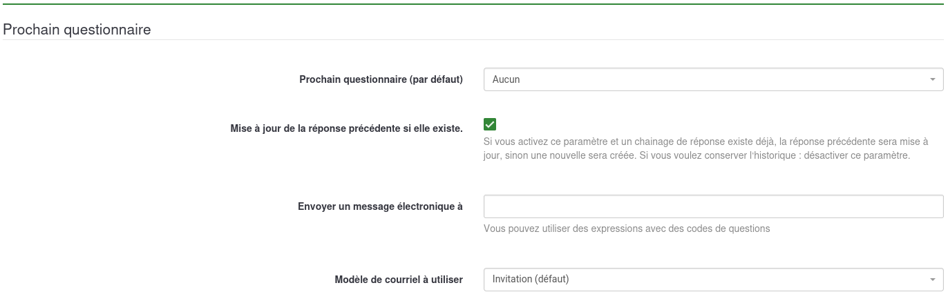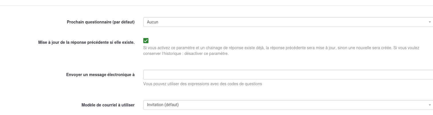 Sinon, dans les questions du plugin du premier questionnaire, j'ai positionné le non du second questionnaire à Next survey (by default). et j'ai rempli une adresse mail à Send email to sur laquelle je reçois un accusé réception d'invitation mais sans lien dedans.
