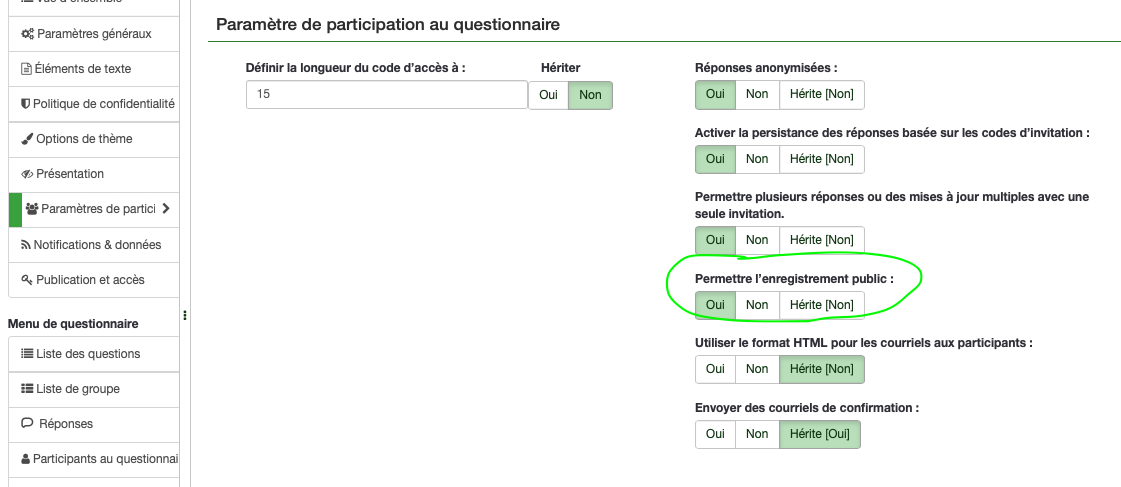 > Je précise  enfin que j'ai du mal à faire afficher le questionnaire complet sans que LimeSurvey me demande systématiquement un code d'invitation que je n'ai pas. Alors je fais le test d'affichage par groupe.