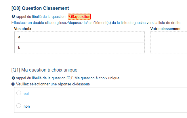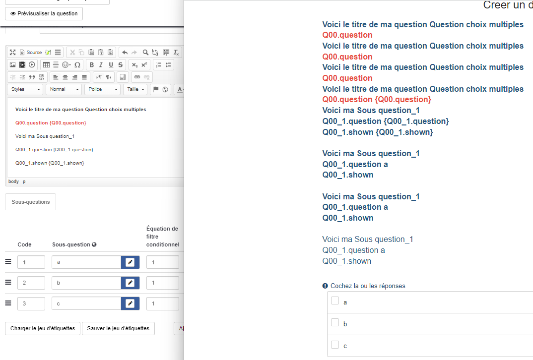 Cela ne pose a priori pas de problème pour les questions à choix unique. Dès lors que nous avons des questions avec des sous-questions (tableaux, multiples cases à cocher...), LM déclencher une erreur lorsqu'on tente d'afficher le libelle de la question mère. Seul les libellés des sous-questions sont accessibles.