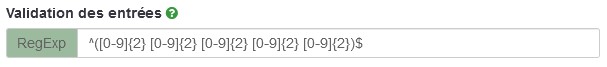 Pour les deux champs de numéros de téléphone, le premier obligatoire, le second optionnel, voici le regex indiqué dans le champ "Validation des entrées" :