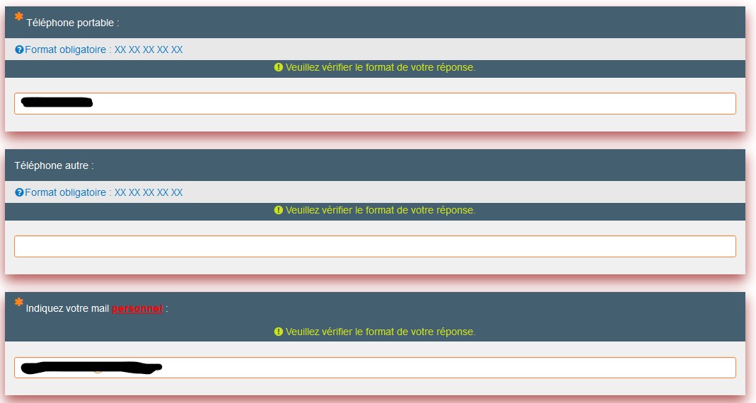 Lors du test, lorsque je clique sur "Envoyer", ces trois champs ressortent en rouge avec le message "Veuillez vérifier le format de votre réponse" (j'ai caché le tél et le mail mais ils correspondent bien au format attendu)