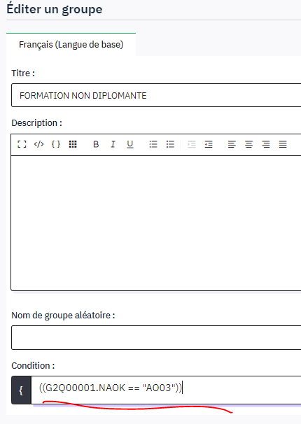 Malgré tous mes tentatives je ne suis pas arrivé pas à conditionner l'affichage d'un groupe de questions en fonction de la réponse à la dernière question du groupe précédent.