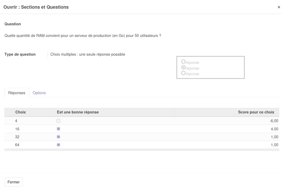 Je n'arrive pas a créer une question à choix multiple, avec pour chaque réponse un score dédié a chaque réponse. La question doit enregistrer le total des points de chaque réponse.
