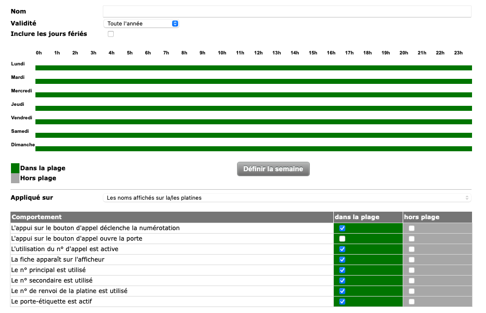Il ne devrait y avoir qu’un seul choix possible entre ces deux options (comme un bouton radio) pour chaque ligne. Cependant, il doit être possible de choisir indépendamment ces options dans deux colonnes distinctes : “dans la plage” et “hors plage” avec des cases à cocher. Autrement dit, les boutons radio ne doivent s’appliquer qu’entre les sous-rubriques d’une même colonne, mais pas entre les colonnes.