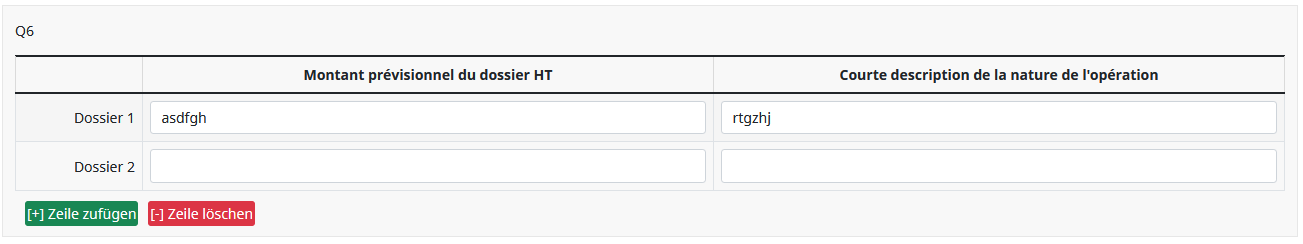 $(document).ready(function() { // A function to add or remove rows of an Array (Multi Flexible)(Text) question function varLengthArray(qID) { if ($('#question'+qID+'').length > 0) { // The HTML content of the Add/Remove elements - modify as you wish var addContent = '[+] Zeile zufügen'; var removeContent = '[-] Zeile löschen'; // Create the Add and Remove elements & insert them var el1 = document.createElement('div'); el1.setAttribute('id','addButton'+qID); el1.setAttribute('class','btn btn-success'); document.body.appendChild(el1); var el2 = document.createElement('div'); el2.setAttribute('id','removeButton'+qID); el2.setAttribute('class','btn btn-danger'); document.body.appendChild(el2); // Move them to after the array $( 'div#addButton'+qID ).appendTo($( '#question' + qID + ' table.ls-answers' ).parent()); $( 'div#removeButton'+qID ).appendTo($( '#question' + qID + ' table.ls-answers' ).parent()); // Insert their HTML $( 'div#addButton'+qID ).html( addContent ); $( 'div#removeButton'+qID ).html( removeContent ); // Style the elements - you can modify here if you wish $( 'div#addButton'+qID ).css({ 'margin':'10px 0 10px 10px', 'padding':'1px', 'text-align':'center', 'width':'auto', 'cursor':'pointer', 'float':'left' }); $( 'div#removeButton'+qID ).css({ 'margin':'10px 0 10px 10px', 'padding':'1px', 'text-align':'center', 'width':'auto', 'cursor':'pointer', 'float':'left' }); // Initially hide the Remove element $( 'div#removeButton'+qID ).hide(); // Call the functions below when clicked $( 'div#addButton'+qID ).click(function (event) { addRow(qID); }); $( 'div#removeButton'+qID ).click(function (event) { removeRow(qID); }); // Function to add a row, also shows the Remove element and hides the //Add element if all rows are shown function addRow(qID) { var arrayRow = '#question' + qID + ' table.ls-answers tr.subquestion-list'; var rowCount = $( arrayRow ).size() - 1; $( arrayRow + '[name="hidden"]:first' ).attr('name', 'visible').show(); $( 'div#removeButton'+qID ).show(); if ( $( arrayRow + ':eq(' + rowCount + ')' ).attr('name') == 'visible' ) { $( 'div#addButton'+qID ).hide(); } } // Function to remove a row, also clears the contents of the removed row, // shows the Add element if the last row is hidden and hides the Remove // element if only the first row is shown function removeRow(qID) { var arrayRow = '#question' + qID + ' table.ls-answers tr.subquestion-list'; var rowCount = $( arrayRow ).size() - 1; $( arrayRow + '[name="visible"]:last input[type="text"]' ).val(''); $( arrayRow + '[name="visible"]:last' ).attr('name', 'hidden').hide(); $( 'div#addButton'+qID ).show(); if ( $( arrayRow + ':eq(1)' ).attr('name') == 'hidden' ) { $( 'div#removeButton'+qID ).hide(); } } // Just some initialization stuff var arrayRow = '#question' + qID + ' table.ls-answers tr.subquestion-list'; var rowCount = ''; // Initially hide all except first row or any rows with populated inputs $( arrayRow ).each(function(i) { if ( i > 0 ) { // We also need to give the hidden rows a name cause IE doesn't // recognize jQuery :visible selector consistently $( this ).attr('name', 'hidden').hide(); $('input[type=text]', this).each(function(i) { if ($(this).attr('value') != '') { $(this).parents('tbody:eq(0)').attr('name', 'visible').show(); $( 'div#removeButton'+qID ).show(); } }); rowCount = i; } }); } } // Call the function with a question ID varLengthArray({QID}); });