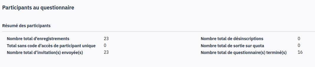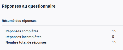Preuve du problème, dans le panneau de gestion des participants, je vois 16 questionnaires complétés, mais je n'ai que 15 réponses dans le panneau des réponses. Par ailleurs, ces réponses sont numérotées 1 à 15, comme si la première n'avais pas existé. Pourtant, j'ai bien reçu le mail de confirmation de participation.