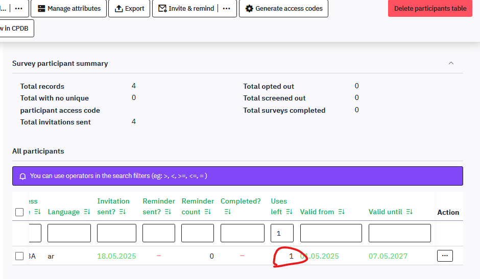 Oui,Bonjour . cette case concerne le nombre de fois que le participant peut répondre ? Ne suffit-il pas d'éditer ce participant : clic sur les 3 points à droite de la ligne --> editer le participant --> mettre le chiffre désiré sans la case Utilisations restantes--> valider. A tester. Cdt