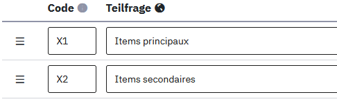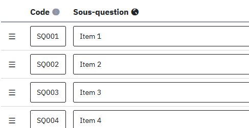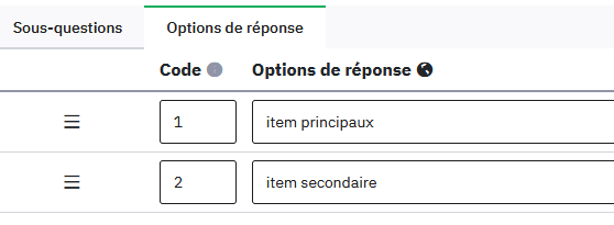Une personne a conçu sur LimeSurvey une question de type "Tableau", avec 2 colonnes et 46 lignes. Chaque ligne = un item, il y a une colonne "items principaux" et une colonne "items secondaires", et des cases à cocher dans chaque cellule du tableau.