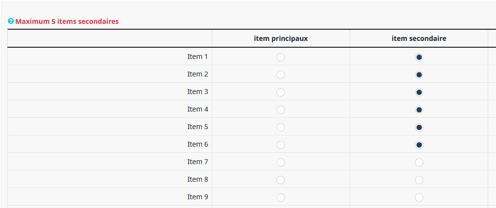 Je me permets de reprendre ce sujet suite à une demande additionnelle de l'enseignant sur le même sujet. En effet, dans la colonne des "items principaux", il souhaite qu'il y ait également un minimum de 10 items à cocher.