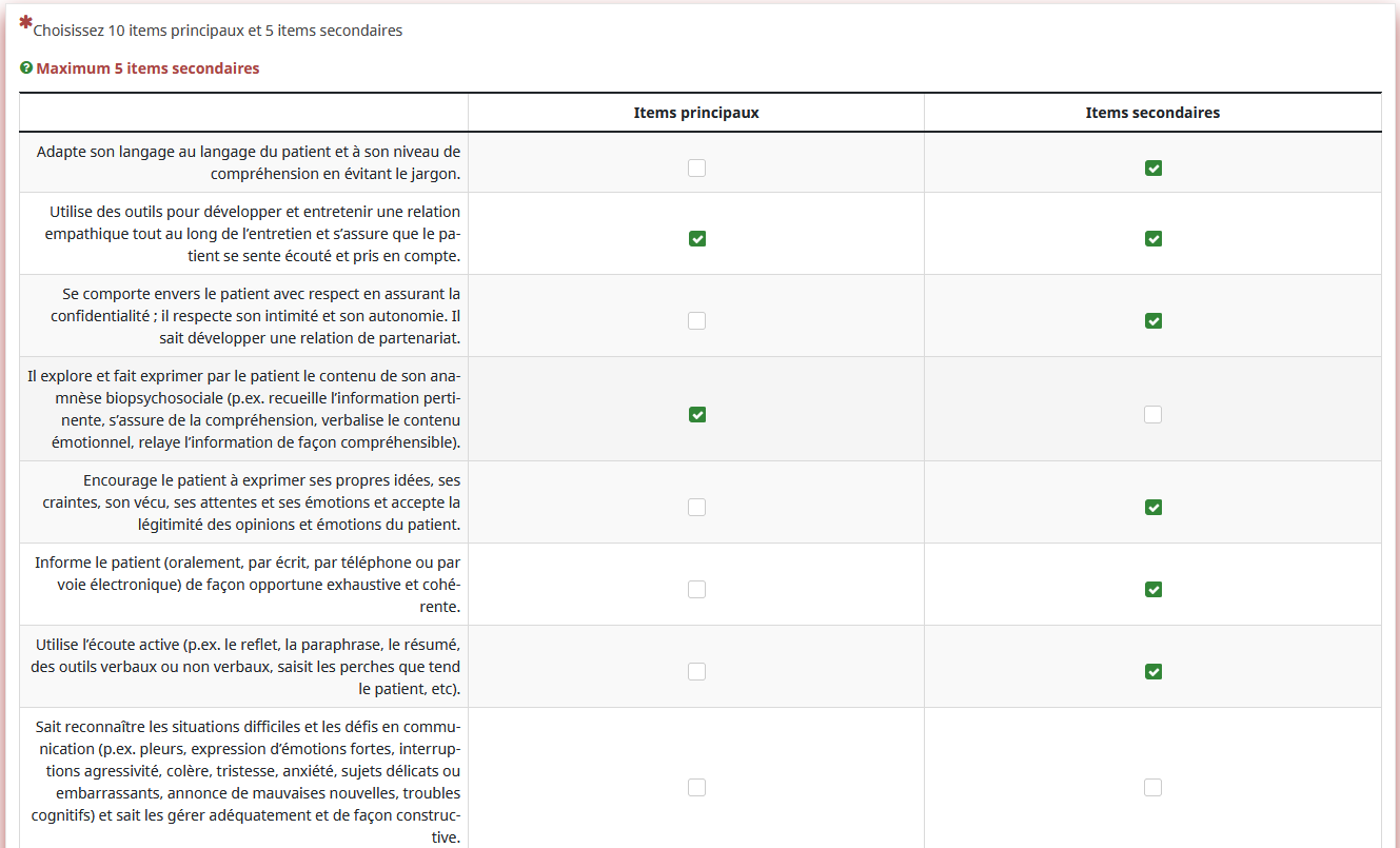 La personne souhaiterait que le répondant ne puisse sélectionner que 10 items dans les "items principaux" et 5 items dans les "items secondaires". Elle souhaiterait également qu'il y ait une zone de commentaire libre pour les réponses sélectionnées.